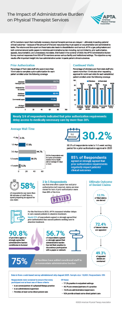 "The data is clear — administrative burden is excessive, unsustainable, and continues to hinder both physical therapists and the patients they serve," says APTA President Kyle Covington, PT, DPT, PhD. "Without meaningful reform, these barriers will continue to strain the workforce and impede timely access to care."