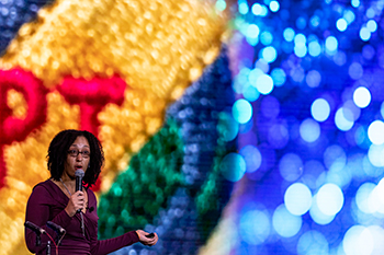 Marilyn Moffat, PT, DPT, PhD, FAPTA, speaks at a dedication of the Marilyn Moffat Atrium, named for her in recognition of her donation to the Campaign for Future Generations. Behind her is a wall sculpture, "Move," with panels that spell out that word in 10 different languages. Moffat is a renowned educator, author, and advocate, and namesake of the APTA Marilyn Moffat Leadership Award.